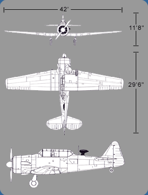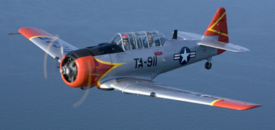 The AT-6A North American Texan, built in 1941, was used as an advanced trainer. It is powered by a Pratt & Whitney R1340 9-cylinder engine producing 600Hp. It swings a Hamilton Standard 2-blade propeller giving a distinct sound matched by no other aircraft today. Designed to give cadets a taste for the higher speeds of fighters, bombers and transport aircraft, almost every airforce around the world at one time or another has used the AT-6 to train their fighter pilots. There were approximately 15,495 Texans produced between 1938-1945. The USAAF procured 10,057 and the others went to the US Navy and more than 30 allied nations. The Aircraft